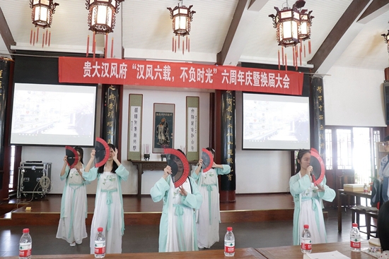 贵大新闻网讯(新闻网编辑部王思萌报道|摄影王焰)6月2日下午,我校汉风府“汉风六载,不负时光”六周年庆暨换届大会在东校区文化书院举行。此次换届大会邀请到我校小德云社、茶道社、记者团、历史文化协会等社团和学生组织及国际教育学院留学生代表,贵州财经大学知行国学社,贵州中医药大学静岚阁,贵州医科大学知行国学社参加。音乐学院任竞铭担任此次换届大会的主持人。