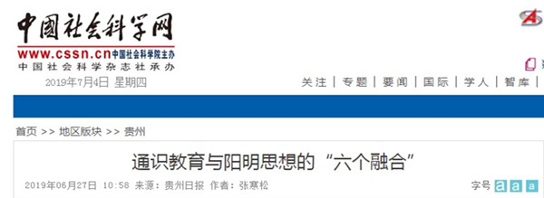 2019年6月27日中国社会科学网刊载贵州大学阳明学院院长张寒松教授《贵州日报》文章,题:通识教育与阳明思想的“六个融合”。全文如下: