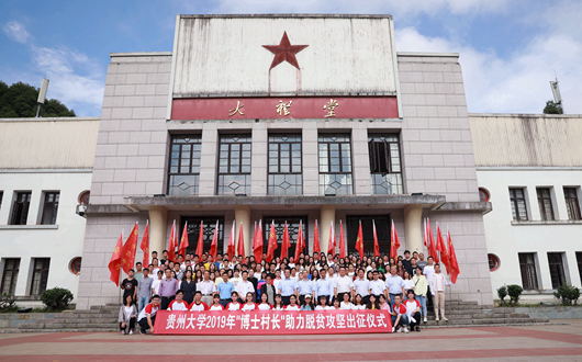 贵大新闻网讯7月10日上午,为深入学习、宣传和贯彻党的十九大和十九届二中、三中全会精神,引导广大青年学生走出校园,深入基层,在社会实践中受教育,服务贵州省地方经济社会发展,我校2019年“不忘初心跟党走,牢记使命建新功”——“博士村长”暑期社会实践活动出征仪式在中国文化书院举行。