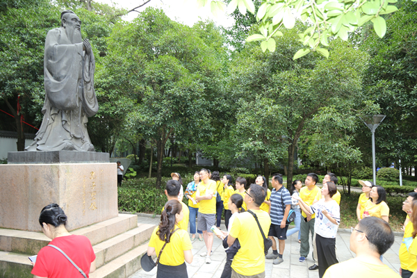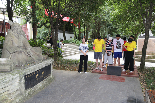 在书院大门内外,办公室人员向大家介绍了有关孔子铜像所传达的“仁爱、和谐、中正、和平”理念、尹珍造像所代表的贵州文化教育的悠久历史以及“贵山书院”石刻所体现的学校前身及自书院改制为贵州大学堂以来的相关发展情况。