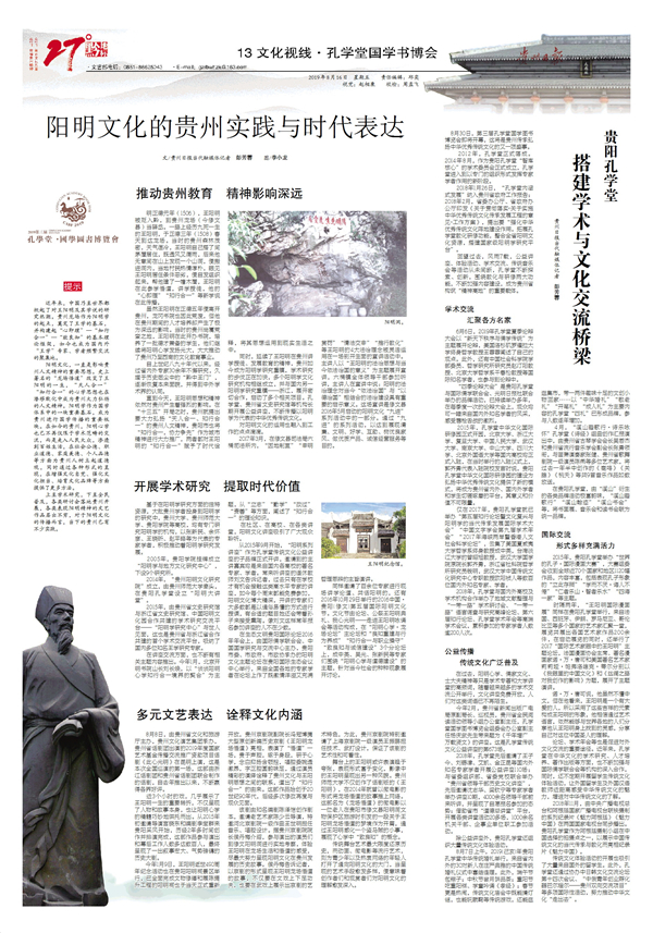 阳明文化,一直是影响贵州人文精神的重要思想。史上著名的“龙场悟道”改变了王阳明的一生,“天人合一”“知行合一”的心学思想也在潜移默化中成为贵州大力弘扬的人文精神。阳明学作为国学体系中的一块重要基石,成为贵州进行国学传播的重要板块。在如今的贵州,阳明心学也已不再仅限于学术范畴的交流,而是走入人民大众,渗透到百姓生活,在社会公德、职业道德、家庭美德、个人品德等方面为贵州人树立起道德观,同时通过各种形式的呈现,在增强文化自觉、强化文化担当、培育文化品牌等方面提供了更多方法。