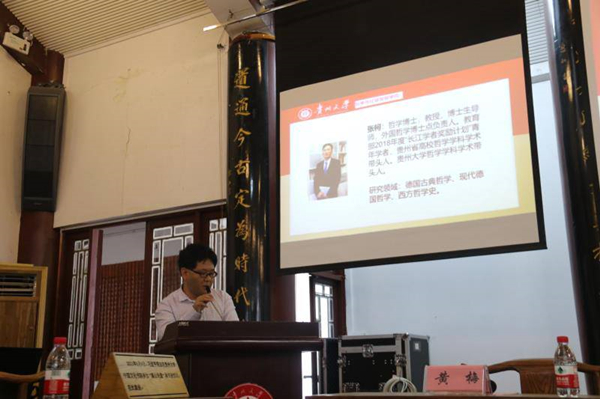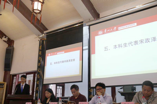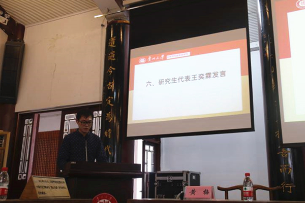 博士研究生代表王奕霖同学结合自己本科和硕士在贵大求学的经历,谈了自己如何学哲学、知哲学、爱哲学的过程。他表示,正是缘于对哲学的热爱、对贵大哲学学院各位老师渊博的学识、深刻的哲思由衷敬佩,使他选择了继续留在这里继续攻读博士研究生。