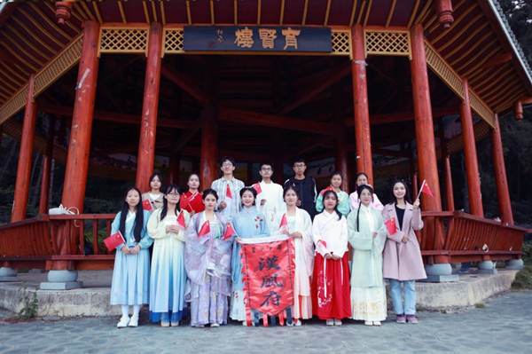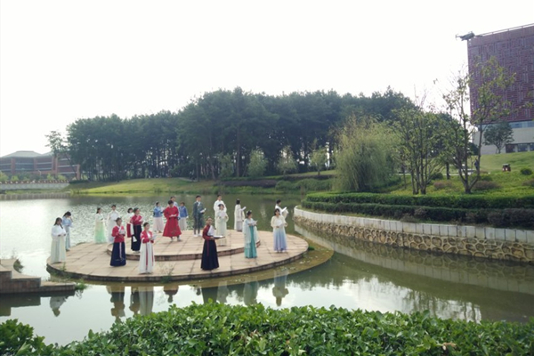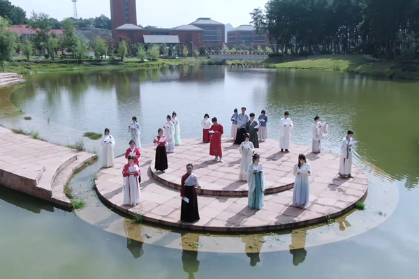 立秋前夕,天气转凉,微风习习。9月21日18:00分,身着中国传统汉服的同学们在西校区鼓楼广场处集合并一同前往阅湖进行汉风国学经典诵读。衣袂飘飘,时光静好。阅湖圆台上,朗诵经典的学子们眉眼沉静而认真。伴随着凉风拂过衣摆与裙裾,《千字文》、《离骚》和《短歌行》等经典篇目吟诵声,婉转回响在阅湖之畔。