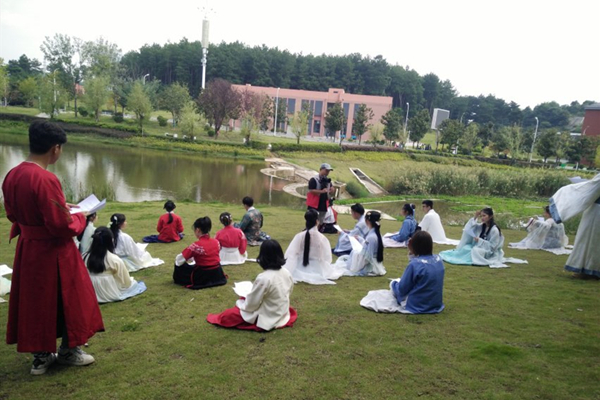 国学经典,千年传承。汉风府同袍们随后又席地而坐,衬着阅湖边的优美风光,捧着手中的雅香书卷,声声婉转诵读。诵读现场,有清脆悦耳的鸟鸣,有树叶随风沙沙作响的声音,还有陶醉于中华传统汉文化的优雅与诗意的同学们。