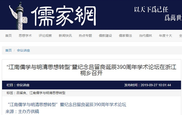 2019年9月20日至22日,由复旦大学上海儒学院、杭州师范大学国学院、桐乡市文化局、崇福镇党委政府共同主办,上海市儒学研究会、桐乡市吕留良研究会协办的“江南儒学与明清思想转型”暨纪念吕留良诞辰390周年学术论坛在吕留良故里浙江桐乡的崇福古镇如期召开。本次会议共收到论文36篇,分别围绕吕留良思想与交游、江南儒学、明清学术转型等核心议题展开了广泛而又深入的探讨。兹从八个方面简要概述此次学术论坛的盛况: