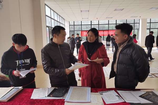 三位评委对书法作品进行了严格的评选。张槐礼指出,评比作品要全面考察,除去书法形体之外,对章法、落款、盖章等也要有所要求。闵军、周兴禄表示,部分学生的书法作品笔力苍劲、主题鲜明,希望喜欢书法、喜爱书写的同学再接再厉,继续努力。