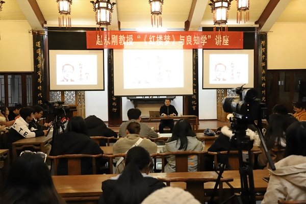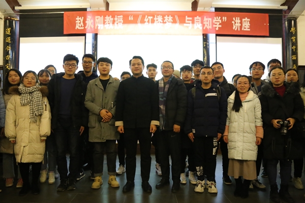 12月5日晚7点,由共青团贵州大学委员会主办、贵州大学汉风府承办、贵州大学学生社团联合会协办的“《红楼梦》与良知学”学术讲座在汉风府所挂靠中国文化书院举行。此次活动主讲人为贵州省红楼梦研究学会副会长、贵州大学文学与传媒学院副教授、中文系主任、汉风府指导教师赵永刚博士。贵州省红楼梦研究学会副会长、贵州大学阳明学院副教授张劲松博士担任点评嘉宾,文学与传媒学院、哲学与社会发展学院、历史与民族文化学院、外国语学院等120余名师生聆听了本次学术讲座。
