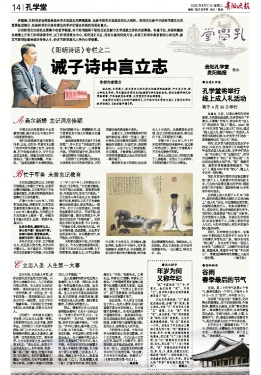 2020年4月21日《贵阳晚报》第A14版“孔学堂”刊载贵州大学文学与传媒学院副教授、中文系主任,贵州省《红楼梦》研究会副会长、贵州省儒学研究会常务理事、贵州大学中华传统文化与贵州地域文化研究中心兼职研究员赵永刚博士“《阳明诗话》专栏之二:诫子诗中言立志”。开篇语及全文如下: