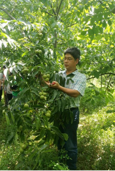 图为2019年我在赫章田间调查核桃新品种“黔核7号”的坐果情况。14年过去了,我始终不渝地服务赫章核桃产业,选育了核桃良种,解决了技术难题,助力“小核桃变为大产业”。