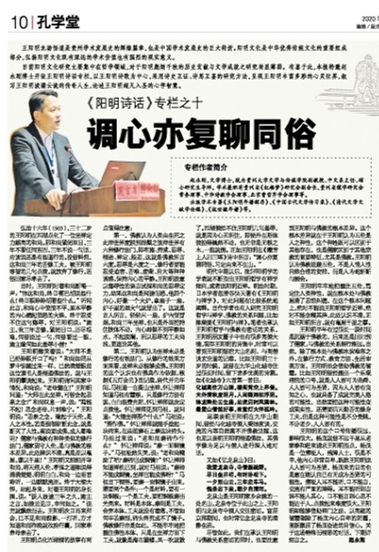 2020年6月19日《贵阳晚报》第A10版“孔学堂”刊载贵州大学文学与传媒学院副教授、中文系主任,贵州省《红楼梦》研究会副会长、贵州省儒学研究会常务理事、贵州大学中华传统文化与贵州地域文化研究中心兼职研究员赵永刚博士“《阳明诗话》专栏之十:调心亦复聊同俗”。编者按及全文如下: