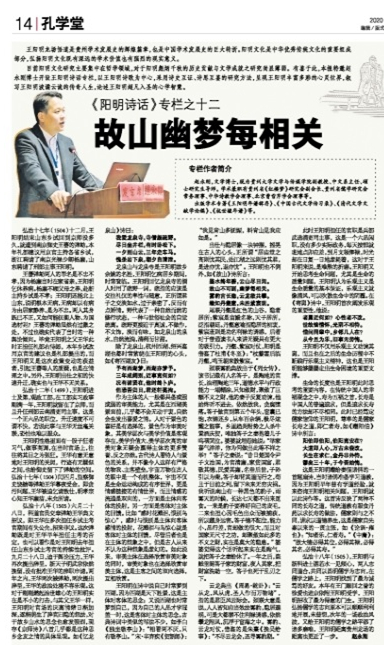 2020年7月9日《贵阳晚报》第A14版“孔学堂”刊载贵州大学文学与传媒学院副教授、中文系主任,贵州省《红楼梦》研究会副会长、贵州省儒学研究会常务理事、贵州大学中华传统文化与贵州地域文化研究中心兼职研究员赵永刚博士“《阳明诗话》专栏之十二:故山幽梦每相关”。编者按及全文如下: