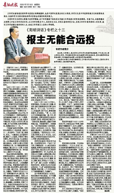 2020年7月16日《贵阳晚报》第A15版“孔学堂”刊载贵州大学文学与传媒学院副教授、中文系主任,贵州省《红楼梦》研究会副会长、贵州省儒学研究会常务理事、贵州大学中华传统文化与贵州地域文化研究中心兼职研究员赵永刚博士“《阳明诗话》专栏之十三:报主无能合远投”。编者按及全文如下: