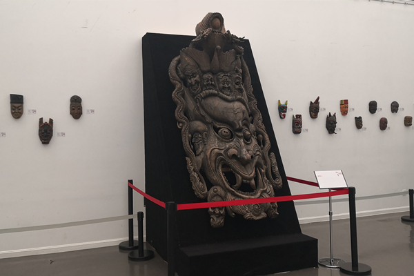 在展出的面具精品中,使用千年古槐整雕而成的“面具王”是我国迄今发现的最大整木雕刻傩面具。该面具净高2.5米、宽1.3米,集贵州地戏面具和傩戏面具造型风格于一体。面具整体气势宏大,造型奇罕、雄浑夸张、表情奇幻、工艺精湛;面具上方附生的各种脸相,构思巧妙、表情各异;双耳所盘飞龙蜿蜒缠绕,直抵额顶,嬉戏抢夺凤凰尾翅上的熠熠宝珠,为中国古今面具所仅见。