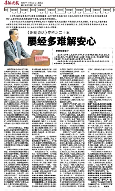 2020年10月23日《贵阳晚报》第A13版“文史博阅”刊载贵州大学文学与传媒学院副教授、中文系主任,贵州省《红楼梦》研究会副会长、贵州省儒学研究会常务理事、贵州大学中华传统文化与贵州地域文化研究中心兼职研究员赵永刚博士“《阳明诗话》专栏之二十五:屡经多难解安心”。编者按及全文如下: