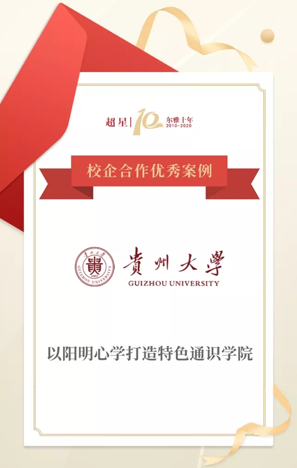 2014年7月,贵州大学在全国范围内较早地设立了专门的通识教育机构——贵州大学阳明学院,通过传承阳明心学中“以人为本”的教育思想,精准打造本校特色课程体系与课程资源,同时在课程引入、承办省级通识素养测评大赛、省情课程制作与推广、全国通识教育会议交流、通识师资培训等各方面与超星尔雅深度合作,形成了独具风格的通识教育开展模式并逐步发挥影响力。