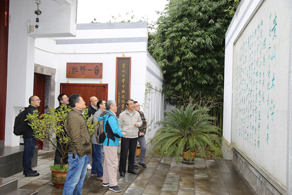 在书院大门前,专家组一行了解贵州文化教育鼻祖尹珍先生远赴中原河南学习、返乡兴学并传播中原文化的情况,以及自明代思想家王阳明在贵州龙场悟道并创建“龙冈书院”、文化脉络延续至清代“贵山书院”进而改制为“贵州大学堂”以来,特别是近几十年来学校的发展变化简况介绍;了解由香港孔教学院院长汤恩佳博士特意赠送中国文化书院的孔子铜像,体会作致礼状孔子铜像所表达的中国传统儒家文化“仁爱、正义、中正、和谐”理念。