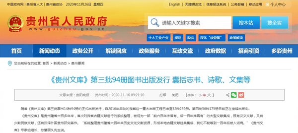 自2016年3月启动,2017年12月推出首批10种53册图书,到2018年12月出版第二批28种92册,再至今年推出14种94册,《贵州文库》本着“精选精编精印”原则,系统发掘、整理贵州历史文化文献资源,重点收录贵州这片土地自有人文典籍以来至中华人民共和国成立之前的经典文献遗存,主要包括贵州籍代表人物的代表作品、非贵州籍人士在贵州工作生活期间的代表作品以及其他涉及贵州内容的在全国有影响力的作品,形成了贵州历史文献的经典集成。