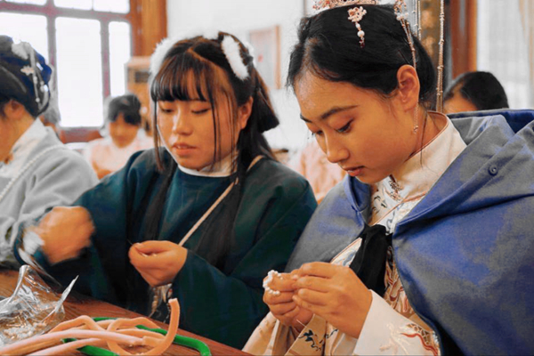 下午16时,带着舞姿的余韵,大家移步汉风府所挂靠的中国文化书院并在此进行学做传统绒花的文化小活动。彩绳缠绕,系紧的是大家对传统汉文化的喜爱。绒花盛开,绽放的是同学们对美好未来的希冀。