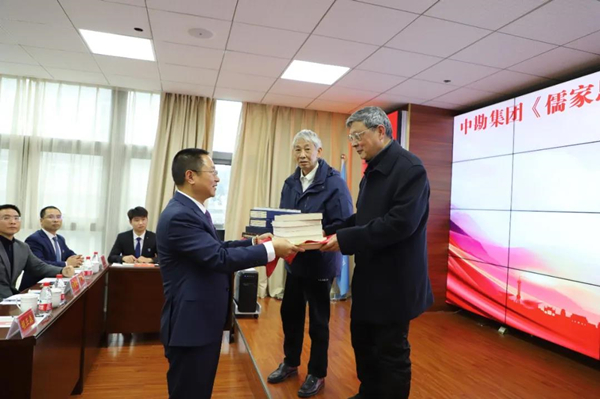观看中勘集团文化宣传片后,张新民老师、杨德俊老师分别向胡正森董事长赠送新近出版发行并由张新民老师审序的《孙山甫督学集》、贵州大学中国文化书院暨中华传统文化与贵州地域文化研究中心主办并由张新民老师主编的大型连续学术辑刊《阳明学刊》(第一至八辑)《王阳明先生传习录》《王阳明先生年谱》《王阳明先生遗墨》等珍稀书籍。