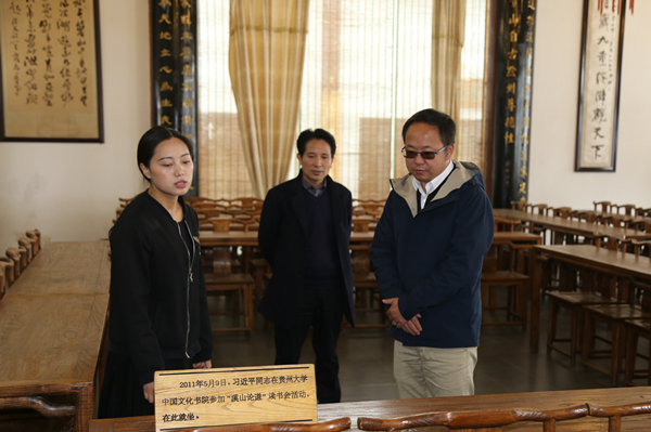 在传道解惑、进德修业的勉学堂大厅和体现“以文会友、以友辅仁”理念的仁文厅等处,客人一行认真听取了关于国家领导人2011年5月9日莅临书院勉学堂,参加“我读《大学》——以‘五四’精神解读‘修齐治平’的当代价值”为主题的“溪山论道”师生读书会活动并发表“5•9”重要讲话的情况及讲话内容简介,了解国家领导人关怀学校发展并为贵州大学亲笔题写校名、参与学生主题班会活动、回信勉励贵大学子,学校师生在书院开展以传统文化为核心的爱国主义文化传承及素质教育等简况。