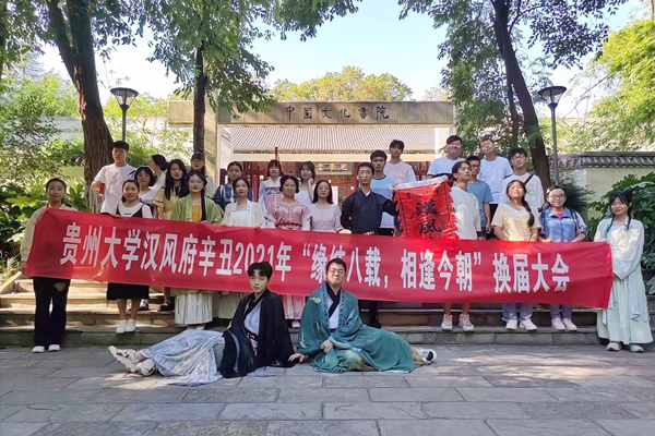 2021年9月25日,汉风府以“缘结八载 相逢今朝”为主题,在所挂靠贵州大学中国文化书院举行第八届社团骨干换届大会。汉风府同袍以及学校学生兄弟社团——小德云社、国学社、民乐协会、生态环境保护协会、社团管理部、书法协会、茶道社、红十字会代表共同参加。