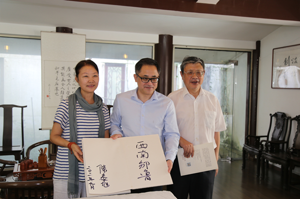 在寓意“以文会友 以友辅仁”的仁文厅,宾主进一步就两岸中华优秀传统文化特别是儒家文化的发展流变、传统文化当代价值与社会价值观构建、传统文化从学术走向大众与民间、传统文化当代传播新载体与新手段等畅叙交流。孔子基金会一行有感于在西南地区贵州大学中国文化书院为传承优秀传统文化的赤诚担当,陈泰旭执行长提笔留言:西南邹鲁。