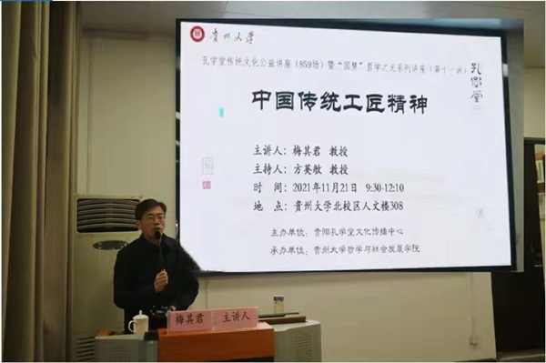 2021年11月21日上午,由贵阳孔学堂文化传播中心主办、贵州大学哲学与社会发展学院承办的孔学堂传统文化公益讲座(第859场)暨贵州大学哲学与社会发展学院“国慧”哲学之光系列讲座(第十一讲)在贵州大学人文楼308会议室成功开讲。