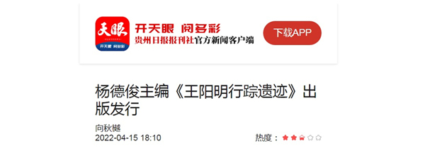 日前,由贵州省儒学会副会长、《龙场阳明文库》总主编、贵州修文阳明文献研究中心理事长、贵州大学中国文化书院(阳明文化研究院)暨中华传统文化与贵州地域文化研究中心特聘兼职研究员杨德俊主编的《王阳明行踪遗迹》,在贵州大学出版社出版。