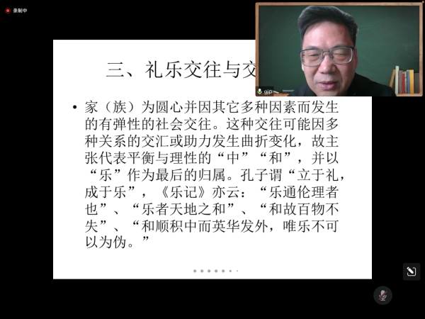 龚教授认为,关于礼乐及其互建关系,《乐记》有着较为集中的论述:首先,从个体角度来说,礼乐从不同方面作用于人,礼以律身,乐以治心;其次,礼乐是人情事理稳定不变的原则;第三,礼主报,乐主施;第四,礼减而进,乐盈而反。总之,作为人生活样式的礼乐,是社会化、理性化的方式;礼乐关系上的内和与外顺、人情与事理的可通约性、报本反始、自我节制与人格完成等,在一定意义上都是既相互区别又相互建构的。