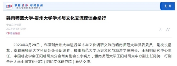 近日,贵州广播电视台官方新闻客户端“动静新闻”及贵州网络广播电视台“贵视网”关注贵州大学中国文化书院(阳明文化研究院)暨贵州大学中华传统文化与贵州地域文化研究中心相关文化活动并全文转载书院(基地)网站相关报道。