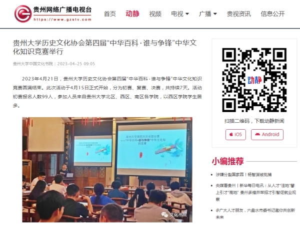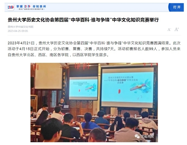 2023年4月25日,贵州广播电视台官方新闻客户端“动静新闻”及贵州网络广播电视台“贵视网”关注贵州大学中国文化书院(阳明文化研究院)暨贵州大学中华传统文化与贵州地域文化研究中心网站关于“贵州大学历史文化协会第四届“中华百科·谁与争锋”中华文化知识竞赛举行”报道。