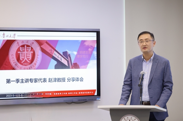 机械工程学院院长赵津教授代表第一季主讲专家发言。他认为,金师、名师引领青年老师们在教学路上更好地前行是义不容辞的责任与使命,希望通过活动的持续开展,感召更多热爱教学的老师一起壮大贵州大学优秀教师队伍。