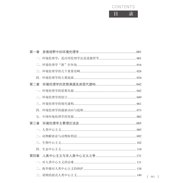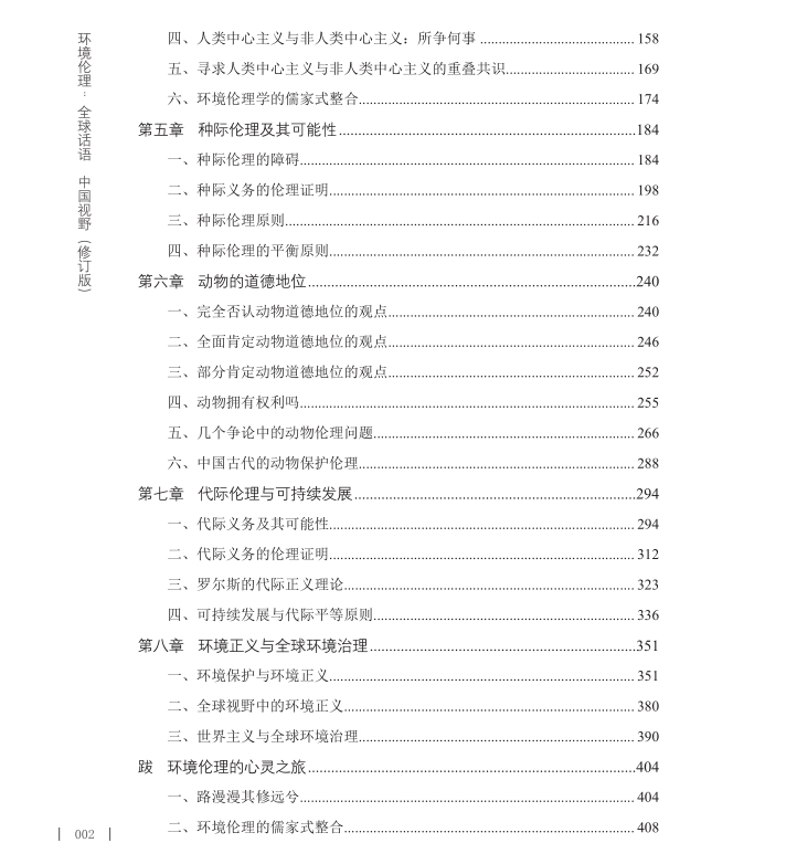 本书“出版前言”显示:环境危机是现代工业文明的结构性特征,所以环境伦理的应运而生也就是情理之中的事情。中国环境伦理学会会长杨通进教授的《环境伦理:全球话语中国视野》从反思调节人与自然的关系、当代人与后代人之间的关系、当代人(特别是不同国家)之间的关系的伦理原则入手,对人类彻底解决现代社会的环境问题进行了深入反思和鞭辟入里的论证。杨通进指出:“作为一种全新的伦理学,环境伦理学的一个革命性的变革就在于,它在强调人际平等、代际公平的同时,试图扩展伦理学的视野,把人之外的自然存在物纳入伦理关怀的范围,用道德来调节人与自然的关系。”所以,环境伦理学就包含了种际伦理、代际伦理和代内伦理的宽广的伦理框架。
