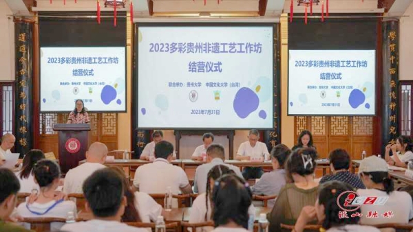 贵大新闻网讯(文字/学生记者 周磊 摄影/学生记者 王平亮)7月31日,2023多彩贵州非遗传统工艺工作坊结营仪式在我校东校区中国文化书院勉学堂举行,本次活动由贵州大学和中国文化大学(台湾)联合举办。贵州省台办交流处处长张华、贵州省教育厅港澳台办公室副处长张彬、中国文化大学(台湾)校长助理蔡佳麟、贵州大学副校长周少奇出席活动。贵州省台办、贵州大学、中国文化大学(台湾)相关部门负责人以及师生代表参加本次活动。结营仪式由贵州大学港澳台办公室主任洪云主持。