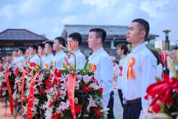 鼓乐起,声声豪迈。在庄严肃穆的氛围当中,身着传统服饰的礼仪人员,手持不同的祭品,整齐有序地走向大成殿前,向至圣先师祭奠花篮,敬献供品,表达炎黄子孙对孔子无限的敬仰和怀念之情。