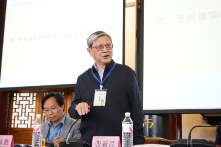 会议进入第三阶段,为深入贯彻落实贵州省“四大文化工程”尤其是“阳明文化转化运用工程”,儒学会专门举办“阳明学与黔学创造性互动及转化运用学术研讨会”。会议由新当选的秘书长栾成斌副教授主持,贵州大学张新民教授、东南大学陆永胜教授、贵州大学黄诚教授、贵阳学院赵平略教授、贵州师范大学王进教授、中勘集团胡正森董事长等作了学术报告。