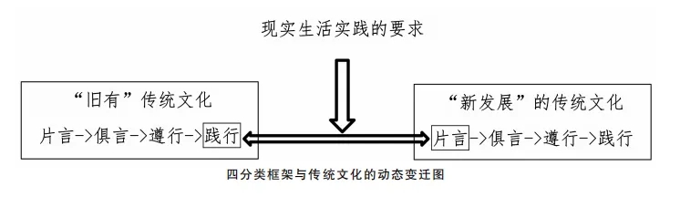 具体而言,传统文化“文本”层面的系统化总结或者抽象容易形成一种路径依赖式的传承机制。因此,传统文化变迁与更新的动力,往往来自行动者具体的社会实践。俱言和遵行都立足于系统化的传统文化“知识”,因此对这两类传统文化社会学模式而言,传统文化变迁动力相对较小。与之相比,行动者在具体的社会情境下践行传统文化的观念和价值时,会因为和生活世界产生多方面的接触而获得更多的机会来感受到情境性实践对于传统文化变革的现实要求,这种要求进而成为经验层面上传统文化变革与发展的动力。从这个角度来看,践行的传统文化社会化过程虽然让传统文化以一种“不言自明”的方式呈现出来,但是也正因为践行发生于现实生活经验之中,反而也是最有可能激发传统文化变迁的一种社会化类型。因此,如下图所示,就“旧有”的传统文化而言,从俱言和遵行向践行的过渡体现出的是变迁动力逐渐加强的过程。