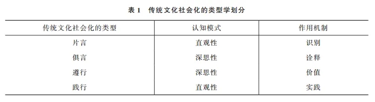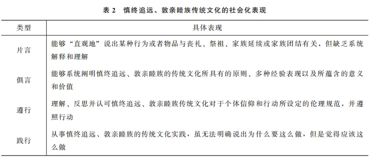 对照上文对于片言、俱言、遵行和践行的概念区分,慎终追远、敦亲睦族的传统文化在达成社会化时,可以呈现出多种类型,如表2所示。