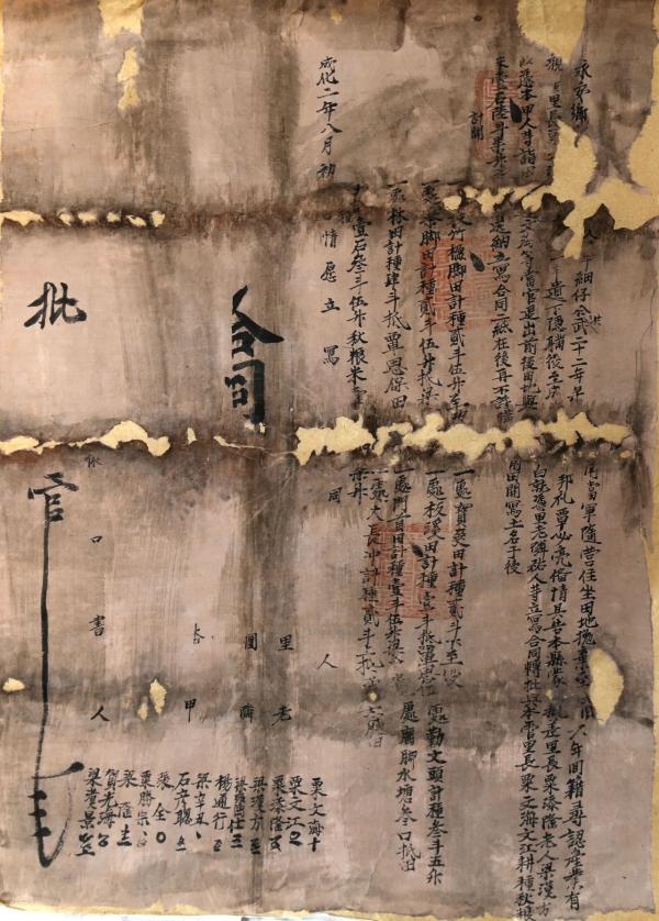 锦屏文书在贵州省黔东南苗族侗族自治州的锦屏、黎平、天柱、三穗、剑河、台江等县有大量保存和发现,包含了各族人民生活、劳作、协商、交往的历史信息,种类繁多,内容丰富,藏量巨大,具有重要的历史研究价值和文献利用价值。迄今发现最早的一份纸质锦屏文书是明成化二年(1466)的田土清退契约,距今已550余年。