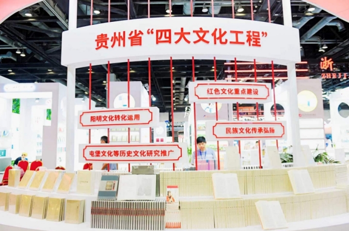 与往年相比,贵州展团今年的展区展陈更具创意,现场活动更为丰富多彩。进入贵州展区,整面嵌入式文化展示墙展陈设计尤为吸睛,《贵州文库》《阳明文库》《屯堡文丛》相关系列丛书从左到右依次排列展示,烘托出展区浓厚的文化氛围。