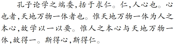 早在隆庆二年戊辰(1568年),孙应鳌等人简摘编辑蒋信文集续集,名曰《道林蒋先生粹言》,孙应鳌在《道林蒋先生粹言序》中已经是站在“学孔”的角度来立论,序言开篇即言道:“万世论学之的则,准诸孔子。”在孙应鳌看来,孔子论学的根本即在求仁,而仁即人心,天地万物一体为仁,所以求仁即求得本心,悟到天地万物一体,即是以“一”为根本:
