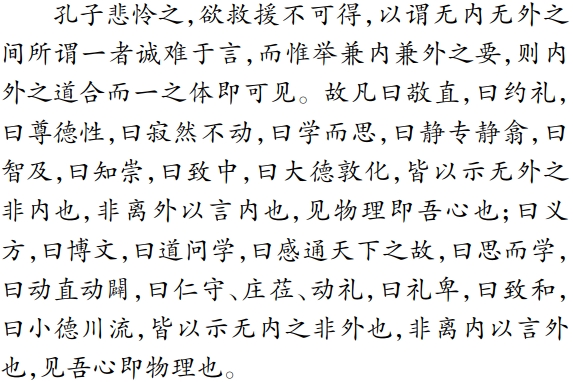 因此,后世的学者不能达到天地万物一体的悟境,则是远离了孔门的宗旨。之所以会出现这种现象,就在后世有内外之分,“奈何后世之学卒不能一,则孔门之旨远矣。何言乎不能一也?心也者,天地万物一体,是无内无外者也。世之是内者,遗事物以论心,其弊将游其心于空无虚寂之归;是外者,溺事物以丧心,其弊将荡其心于形器支离之末。贤知之过,愚不肖之不及,率是焉”。孔子欲救其弊,然而无内无外之间即是一,难以用语言表示,于是则列举兼内兼外的要点,如“敬直”“约礼”“义方”“博文”等,以说明内外之道合而一体亦由此可见: