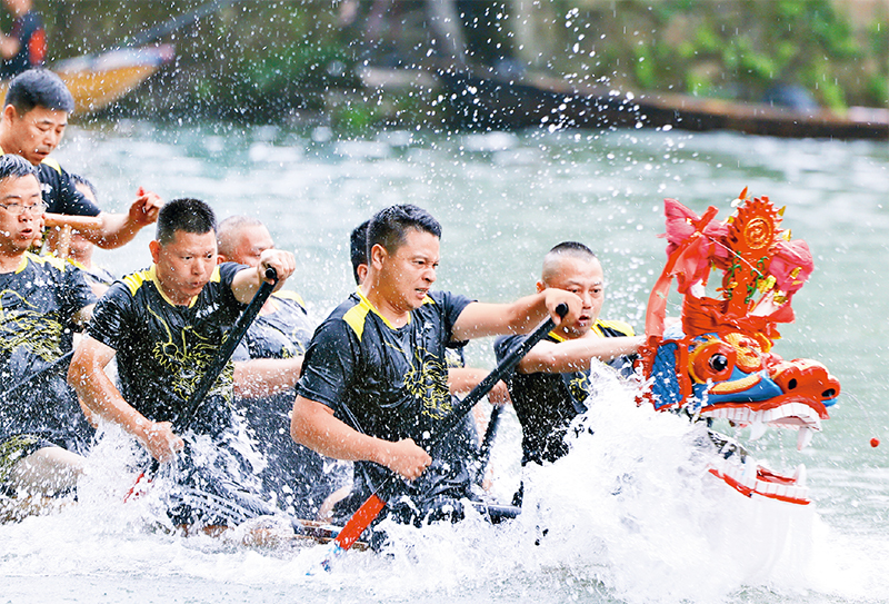 端午节是中华民族重要的传统节日,也是传承中华优秀传统文化的重要载体。图为2024年6月10日,浙江杭州西溪国家湿地公园浪花飞溅,鼓点激昂,上演激动人心的端午传统项目“龙舟胜会”。中新社发周方玲/摄