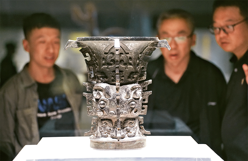 历史文化遗产承载着中华民族的基因和血脉。何尊是西周成王时期一个名叫“何”的宗室贵族所做的祭器,尊内底铸铭文中有“宅兹中国”四字,是“中国”一词最早的实物见证。图为2024年5月9日,游客在陕西宝鸡青铜器博物院内参观西周文物何尊。新华社记者邵瑞/摄