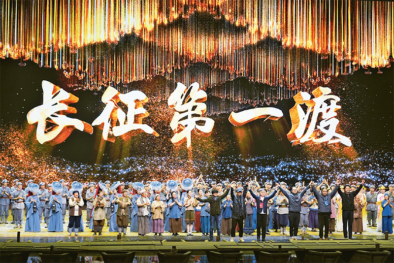 红军将士用生命和热血铸就的伟大长征精神,是革命文化的重要组成部分,具有穿越时空的强大感召力。2023年3月23日,大型红色文旅史诗《长征第一渡》在江西于都长征大剧院首演,观众在沉浸式体验中感受长征时期的峥嵘岁月。图为演出现场。新华社记者万象/摄
