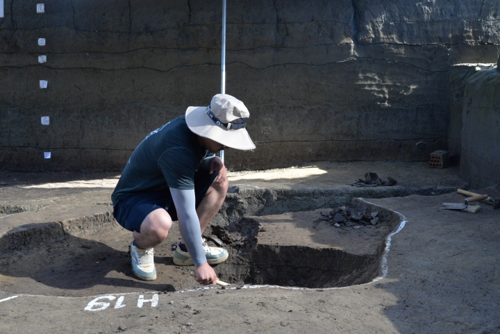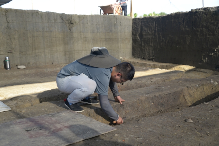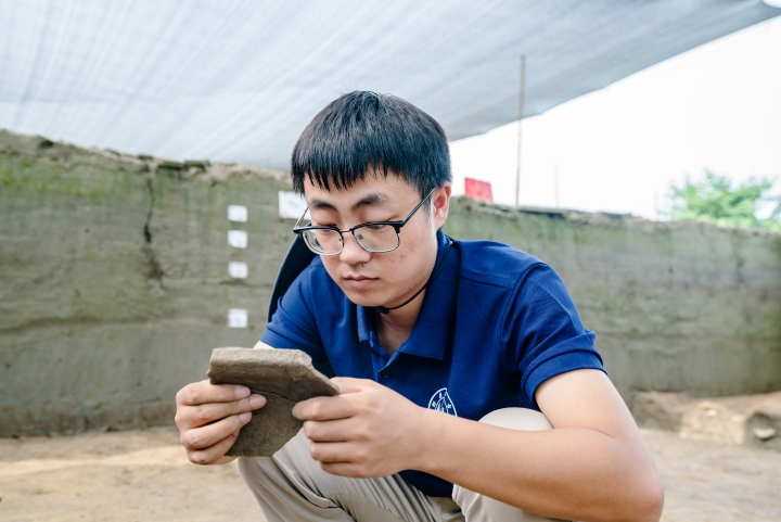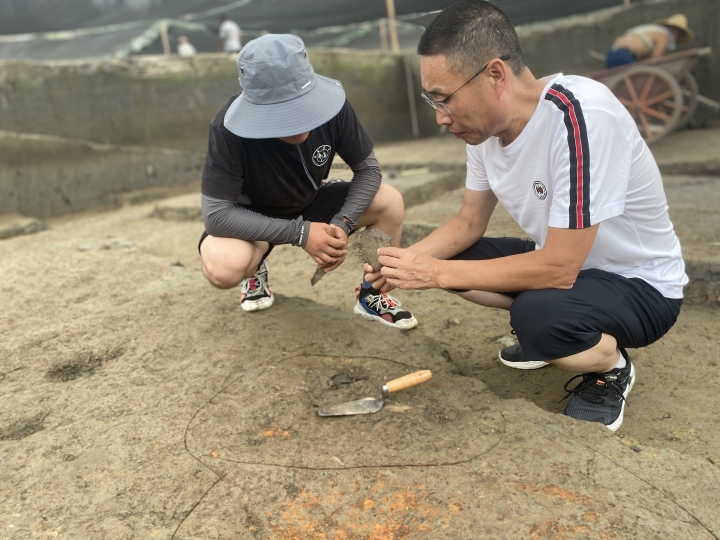 特别是7月进入盛夏以来,队员们不畏酷暑,顶着烈日在野外持续开展发掘工作。自每一个黎明时起,队员们整日在作业现场与泥土打交道,时而在辨认遗迹的中俯身刮面,凝神深思,时而挥动手铲,识土划线,剔理堆积,力求准确细致,精益求精。热气蒸腾,汗水常常使得队员们衣衫湿透,雨后的手上、鞋上更是沾满黄泥。