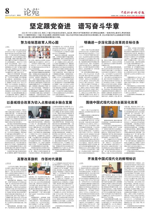 2024年7月15日至18日,党的二十届三中全会在北京举行。连日来,贵州大学干部教师深入学习贯彻全会精神,一致表示将认真学习、贯彻和落实党的二十大精神和党的二十届三中全会精神,把思想和行动统一到以习近平同志为核心的党中央决策部署上来,在以中国式现代化全面推进中华民族伟大复兴新征程上谱写高等教育高质量发展的奋斗华章。