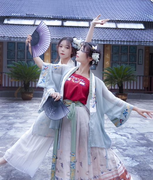 两位身着汉裳的姑娘在石砖上翩翩起舞,宛如姣美的月宫仙子,又如灵动活泼的捣药月兔。一曲毕,舞停,而观众们俨然还沉醉在她们妙曼的舞姿当中。