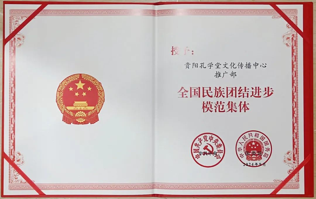 9月27日,首次以党中央、国务院名义开展的全国民族团结进步模范表彰大会上,352个全国民族团结进步模范集体和368名全国民族团结进步模范个人表彰对象一一上台领奖授牌,贵阳孔学堂文化传播中心推广部位列其中。