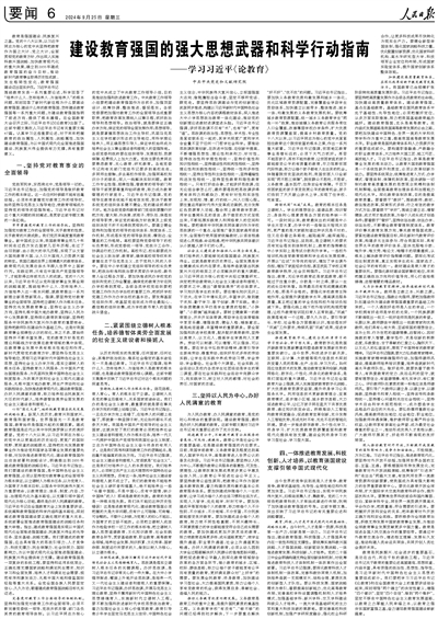 心怀“国之大者”,始终把教育摆在优先发展的战略位置。纵观人类历史,教育兴则国家兴,教育强则国家强。世界强国无一不是教育强国,教育始终是强国兴起的关键因素。建成教育强国是近代以来中华民族梦寐以求的美好愿望。党的十八大以来,以习近平同志为核心的党中央以更高远的历史站位、更宽广的国际视野、更深邃的战略眼光,坚持把优先发展教育事业作为推动党和国家各项事业发展的重要先手棋,对加快推进教育现代化、建设教育强国作出总体部署和战略设计,明确提出到2035年建成教育强国的战略目标。习近平总书记指出,我们要建设的教育强国,是中国特色社会主义教育强国,必须以坚持党对教育事业的全面领导为根本保证,以立德树人为根本任务,以为党育人、为国育才为根本目标,以服务中华民族伟大复兴为重要使命,以教育理念、体系、制度、内容、方法、治理现代化为基本路径,以支撑引领中国式现代化为核心功能,最终是办好人民满意的教育。习近平总书记在全国教育大会上发表重要讲话,系统阐释教育强国的科学内涵和基本路径,深刻阐述教育强国建设要正确处理好的重大关系,系统部署全面推进教育强国建设的战略任务和重大举措。指出,建成教育强国是实现以中国式现代化全面推进强国建设、民族复兴伟业的先导任务、坚实基础、战略支撑。我们要建成的教育强国,应当具有强大的思政引领力、人才竞争力、科技支撑力、民生保障力、社会协同力、国际影响力,为以中国式现代化全面推进强国建设、民族复兴伟业提供有力支撑。建设教育强国是一项复杂的系统工程,要坚持和运用系统观念,正确处理支撑国家战略和满足民生需求、知识学习和全面发展、培养人才和满足社会需要、规范有序和激发活力、扎根中国大地和借鉴国际经验等重大关系。全党全国各族人民要坚定信心、久久为功,朝着建成教育强国战略目标扎实迈进。